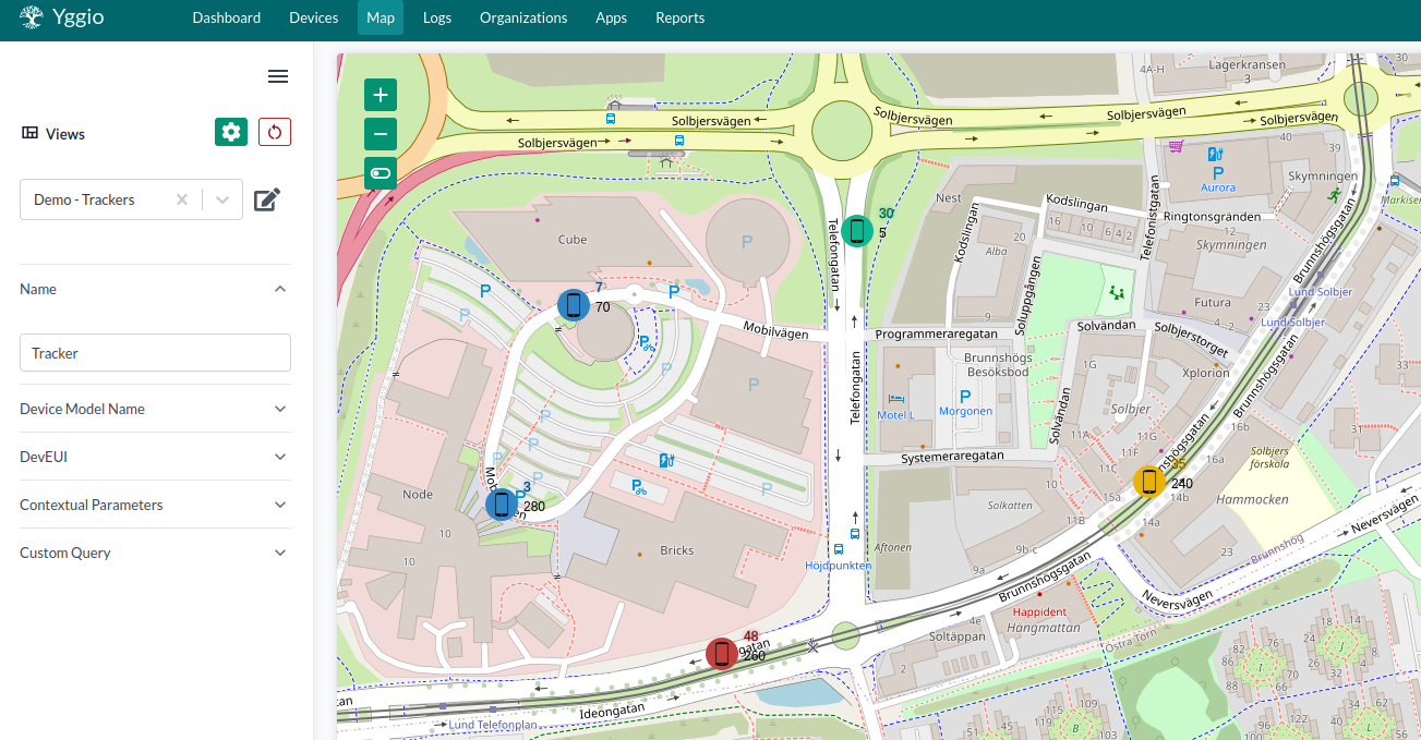 Precis som Enheter tillåter Kartfunktionen skapande av realtidsvyer med filter baserade på FIWARE Q-frågor. Detta möjliggör geografisk filtrering av enheter, vilket gör det enkelt att hitta intressanta dataområden. Kartan stöder också geofencing, vilket underlättar olika spårningsrelaterade användningsfall.