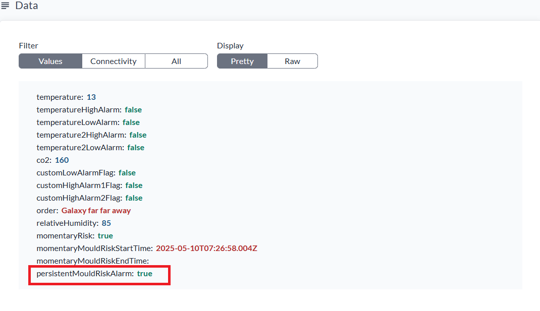 När det finns en verklig mögelrisk kommer ett fjärde fält, persistentMouldRiskAlarm, att visas i Data‑fältet (därmed har momentaryRisk varit true under en obruten period på 18 dagar) med värdet true. PersistentMouldRiskAlarm ser ut så här: