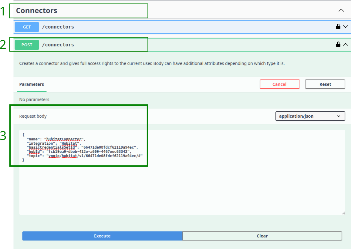 De två första bilderna nedan illustrerar hur du hämtar Connector Id från avsnittet Connectors i Swagger-applikationen. Detta kan vara nödvändigt om du inte kopierade det i avsnitt XI. Skapa en Hubitat Connector steg 6, eller om du har förlorat Connector Id. För att göra detta måste du: